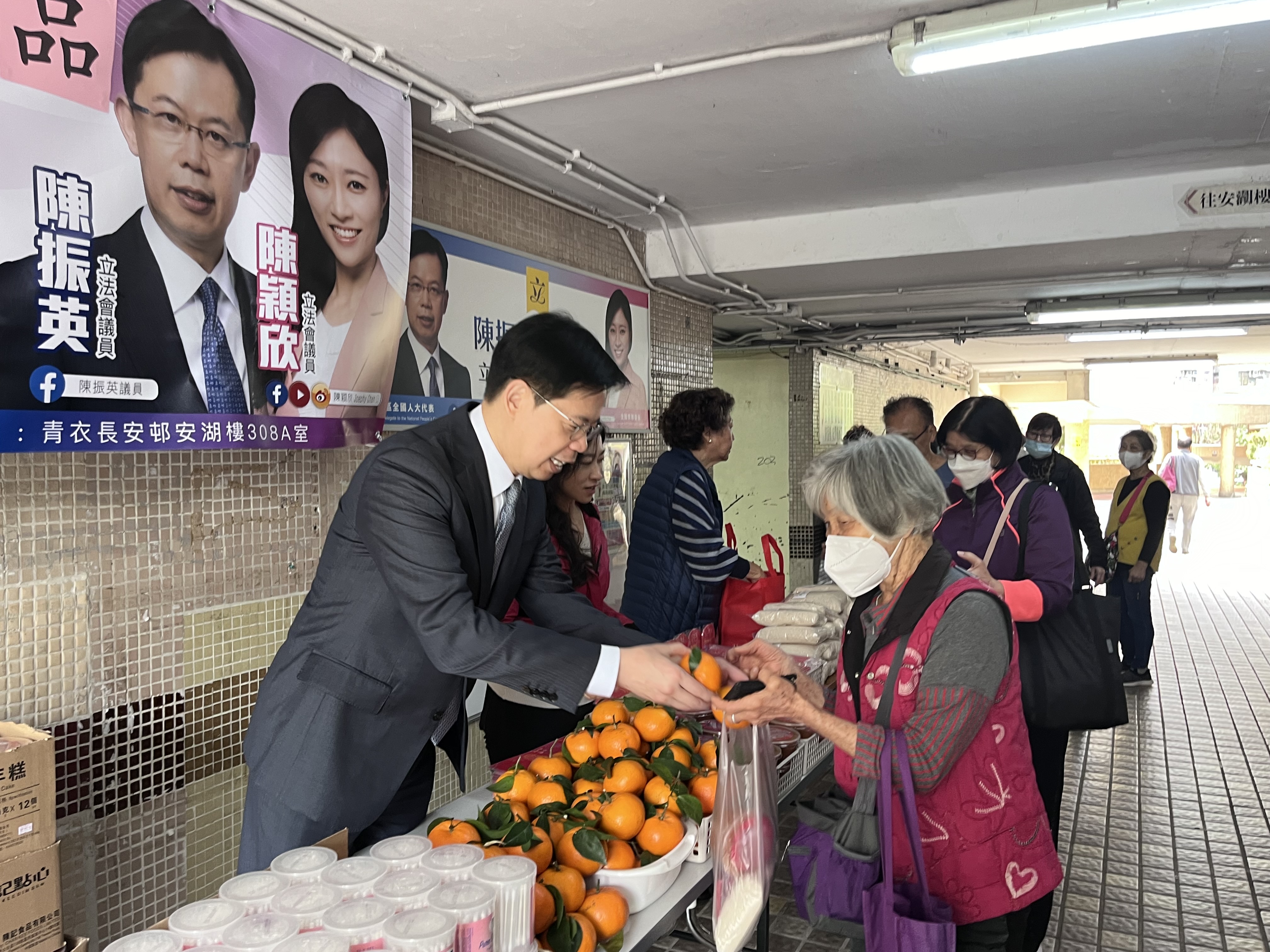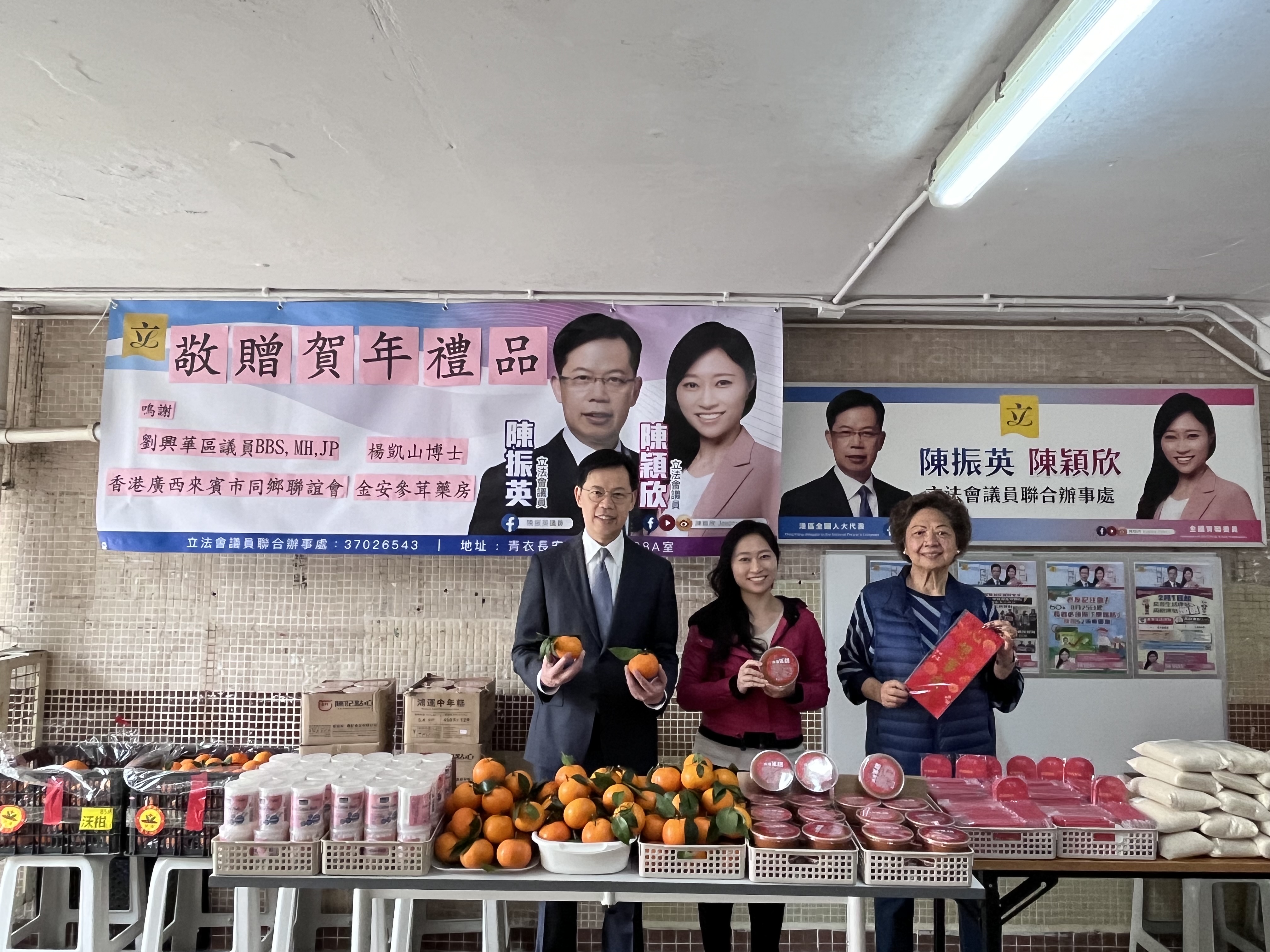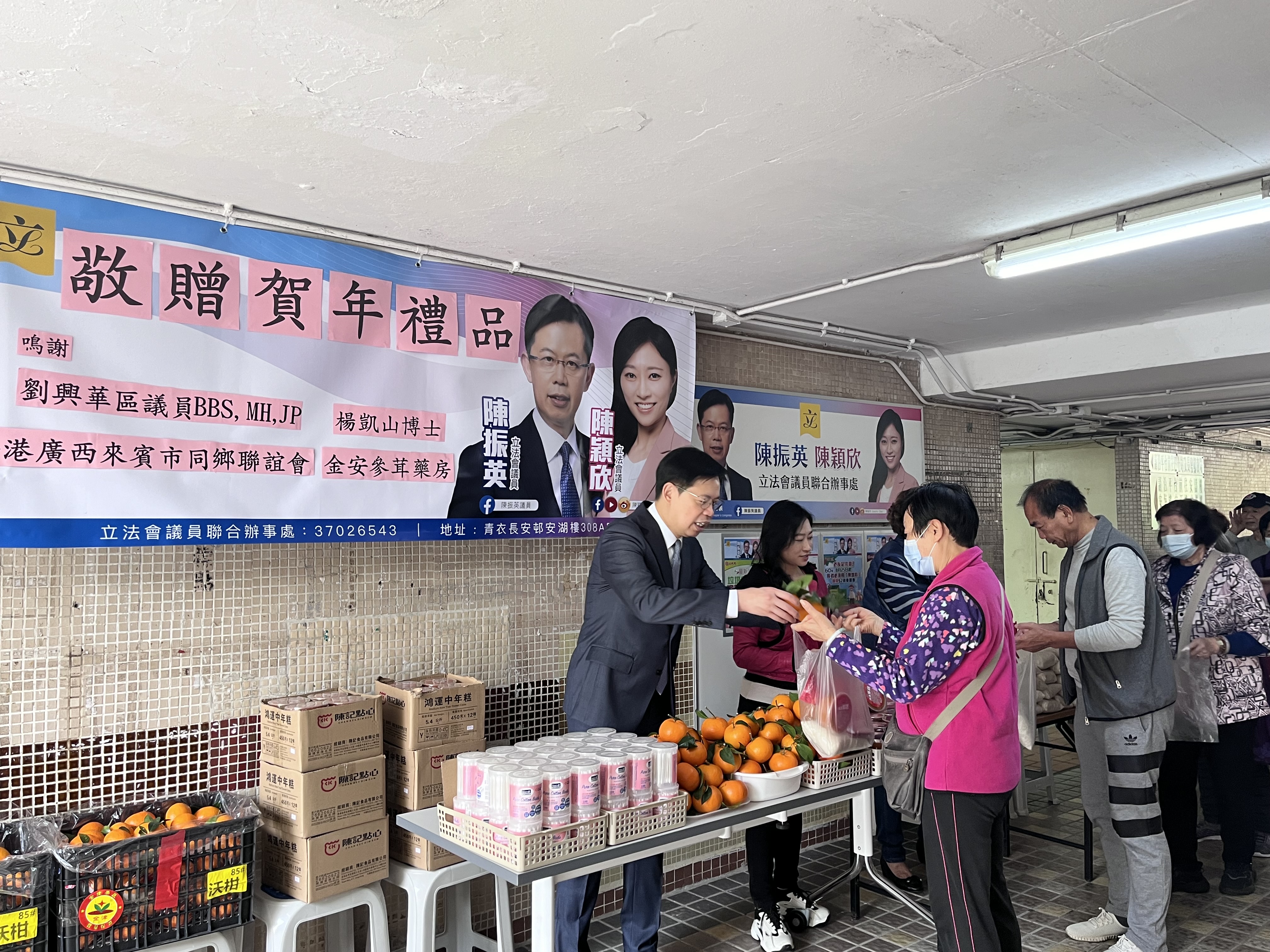 Distributing New Year gifts to residents at the Cheung On Estate District Office in Tsing Yi with Member Chan Wing-yan January 6, 2024 January 10, 2025