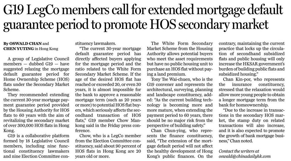 G19 LegCo members call for extended mortgage default guarantee period to promote HOS secondary market July 15, 2023 July 19, 2023 Issued at China Daily Hong Kong on 15 July 2023