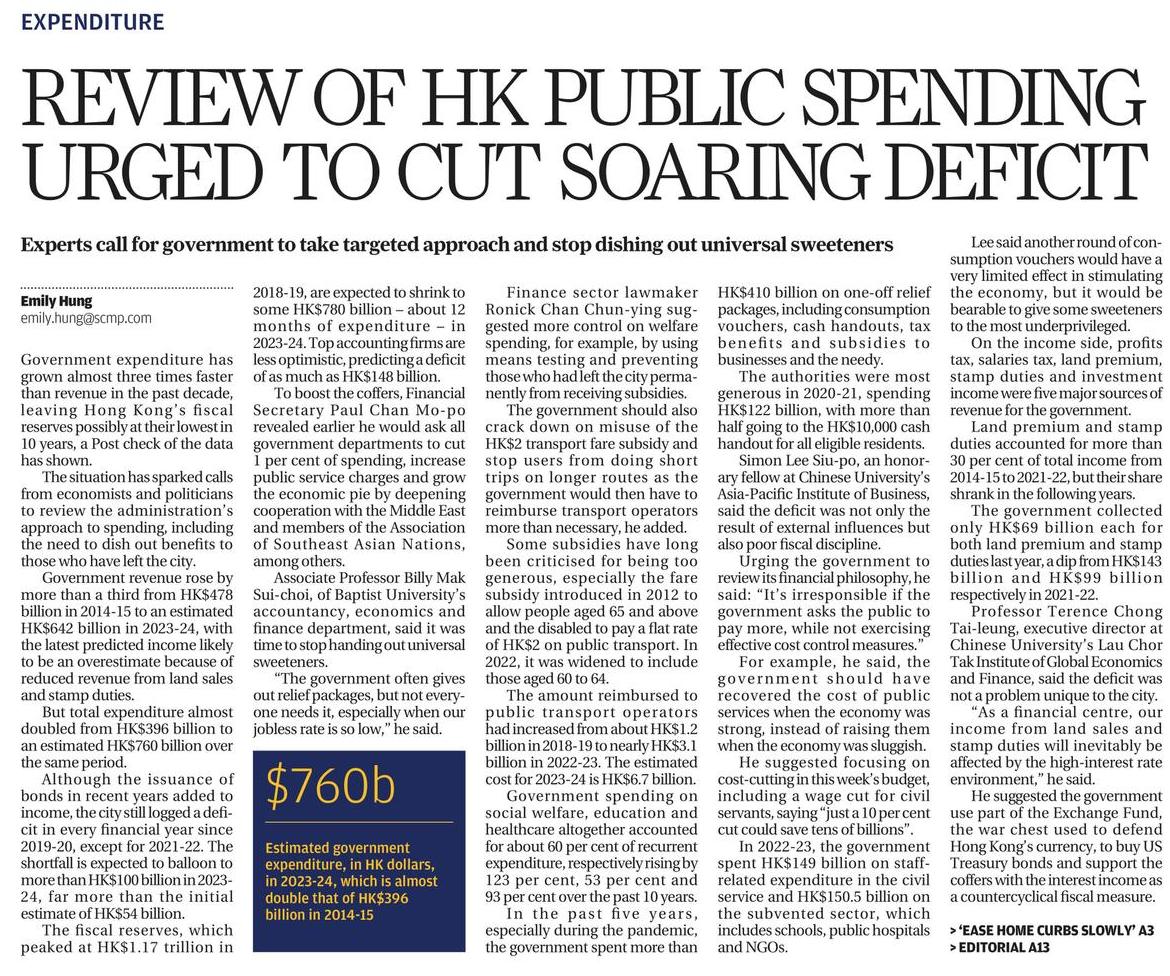 Review of HK public spending urged to cut soaring deficit February 24, 2024 March 4, 2024 Issued at South China Morning Post on 24 February 2024