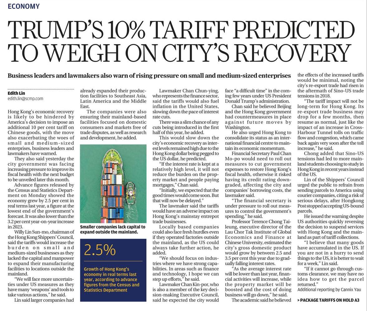 Trump’s 10% tariff predicted to weigh on city’s recovery February 9, 2025 February 19, 2025 Issued at South China Morning Post on 9 February 2025