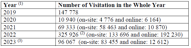 Note 2: The number of visitation of the exhibition “Envisioning Beyond Legacy” (264 000 in total, including on-site: 111 000 and online: 153 000) has been included. The exhibition, jointly presented by the Development Bureau and the Planning Department, was held from July 6 to November 30, 2022, (the outdoor exhibition ended on January 2, 2023) to celebrate the 25th Anniversary of the establishment of the Hong Kong Special Administrative Region.