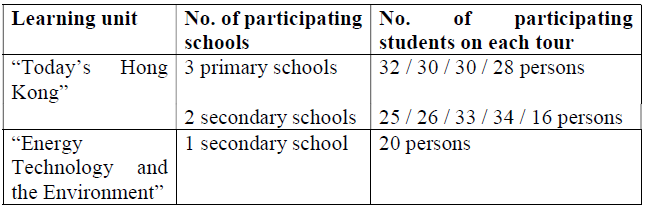 (3) From September 2014 to June 2019, CG organised “School Thematic Tour Scheme” programmes with different themes each year. This Scheme mainly aimed to introduce the interactive exhibits of the CG systematically via guided tour, encourage students to learn proactively and enhance their understanding about the planning and infrastructural developments of Hong Kong in the past, present and future. The themes for 2019 were “Today’s Hong Kong” and “Energy Technology and the Environment”, with six participating schools (a total of 10 tours) and 274 participating students in total. The breakdown is set out below:
