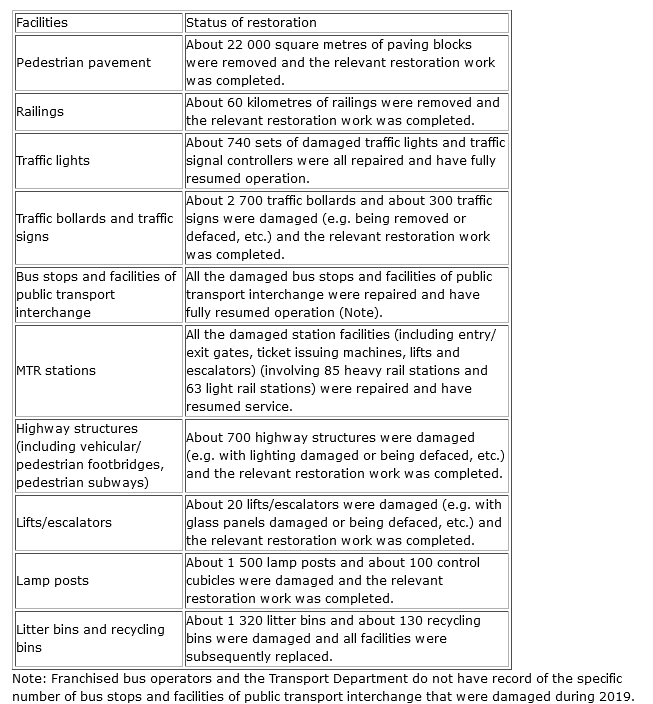(1) The major public and transport facilities damaged during the black-clad violence have been restored with details as follows: