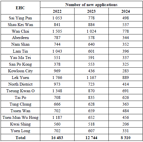 The number of new membership applications received annually by each EHC in the past three years are as shown in the table below. The number of new applications has shown a declining trend in view of factors such as the establishment of the DHCs and the elderly’s preference for receiving health assessments and services at the DHCs, etc.