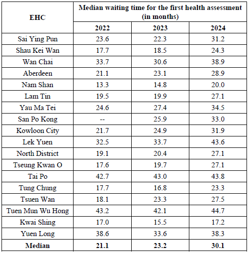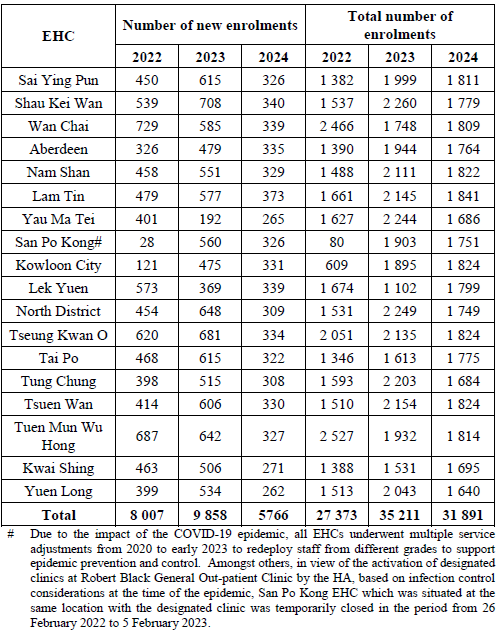 The number of new enrolments and total number of enrolments at the EHCs both declined significantly in 2024. Meanwhile, the median waiting time for the first health assessment was notably longer at most EHCs in 2024. Key factors contributing to the longer median waiting time in that year include the backlog of applications accumulated during the COVID-19 epidemic when the EHCs could only provide limited services from January 2020 to February 2023. Additionally, although services at the EHCs resumed normal starting from February 2023, the accumulated backlog of waiting applications and the persistent shortage of the DH’s medical staff have impacted the service capacity. This has also contributed to the decline in both the number of new enrolments and the total number of enrolments in 2024.