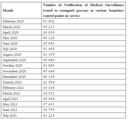 From February 2020 to July 2021, the numbers of Notification of Medical Surveillance issued to exempted persons (including those exempted under Cap. 599C and 599E) at various boundary control points are as follows: