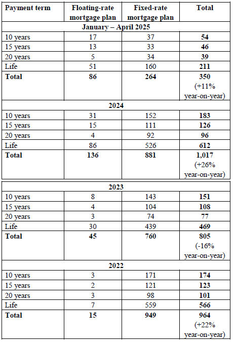 (1) of the respective numbers of applications for the (i) floating-rate and (ii) fixed-rate mortgage plans under the Programme in each of the past three years, together with a breakdown by payout period (i.e. 10 years, 15 years, 20 years and life); the number of applications for the enhanced fixed-rate mortgage plan under the aforesaid fixed-rate mortgage plan;