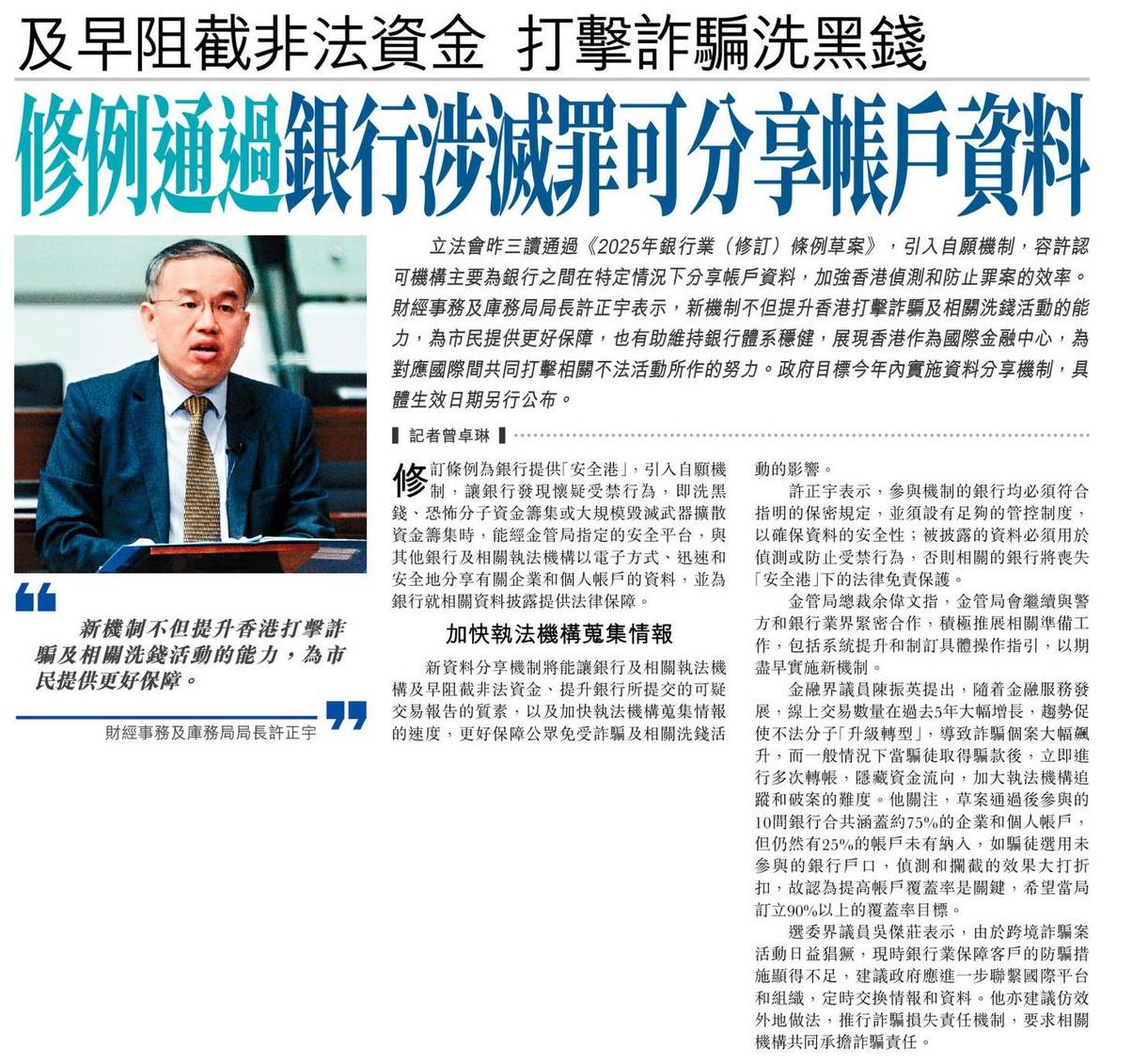 修例通過銀行涉滅罪可分享帳戶資料 及早阻截非法資金打擊詐騙洗黑錢