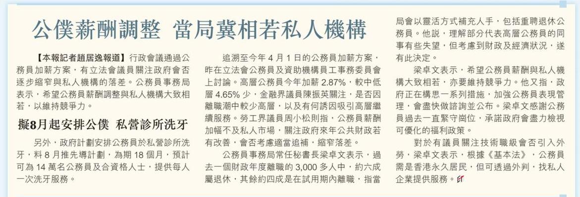 公僕薪酬調整 當局冀相若私人機構