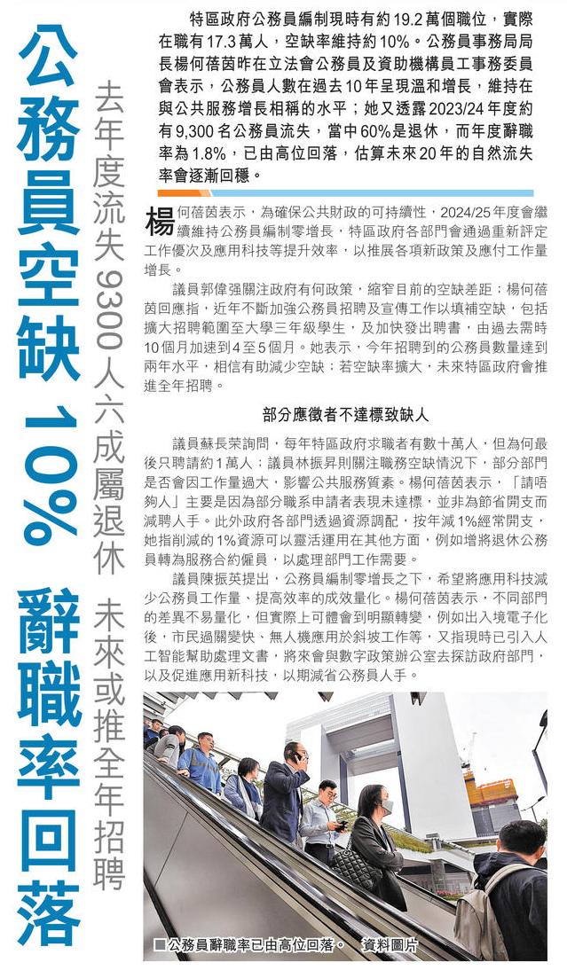 公務員空缺10% 辭職率回落 去年度流失9300人六成屬退休 未來或推全年招聘