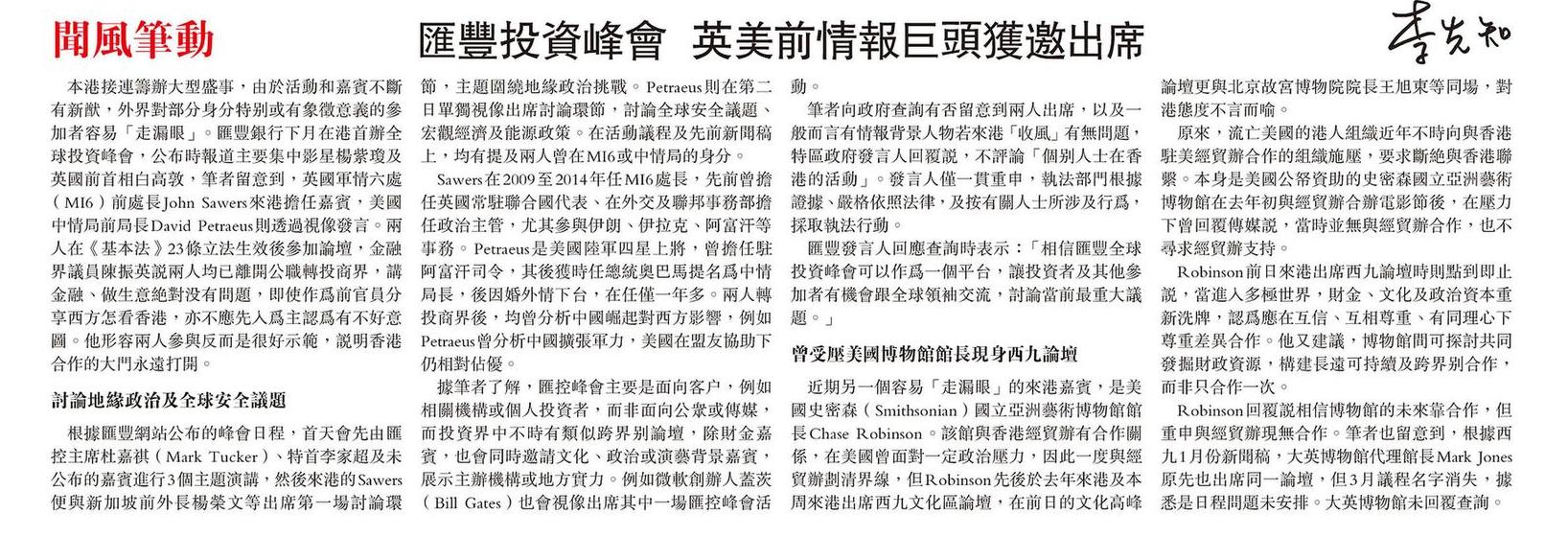 匯豐投資峰會 英美前情報巨頭獲邀出席
