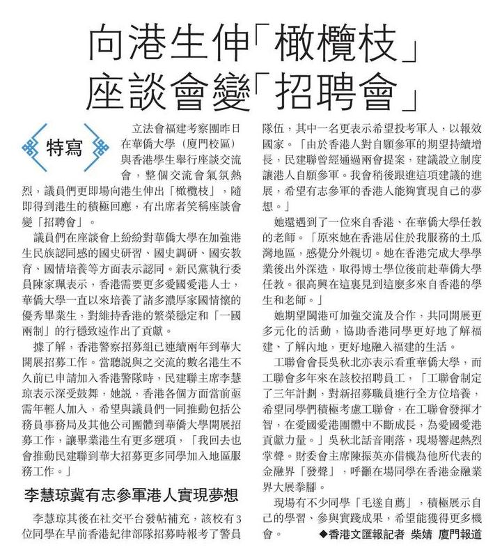 向港生伸「橄欖枝」 座談會變「招聘會」