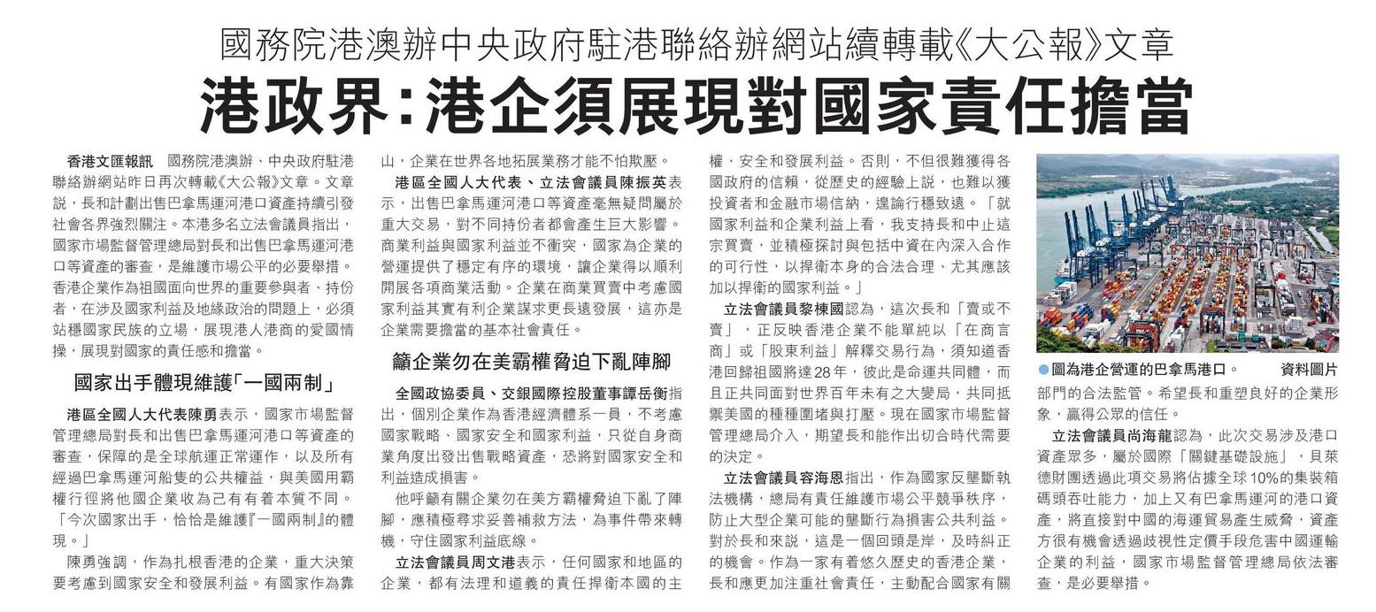國務院港澳辦中央政府駐港聯絡辦網站續轉載《大公報》文章 港政界:港企須展現對國家責任擔當