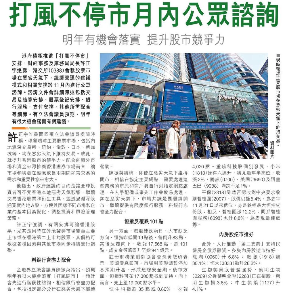 打風不停市月內公眾諮詢 明年有機會落實 提升股市競爭力