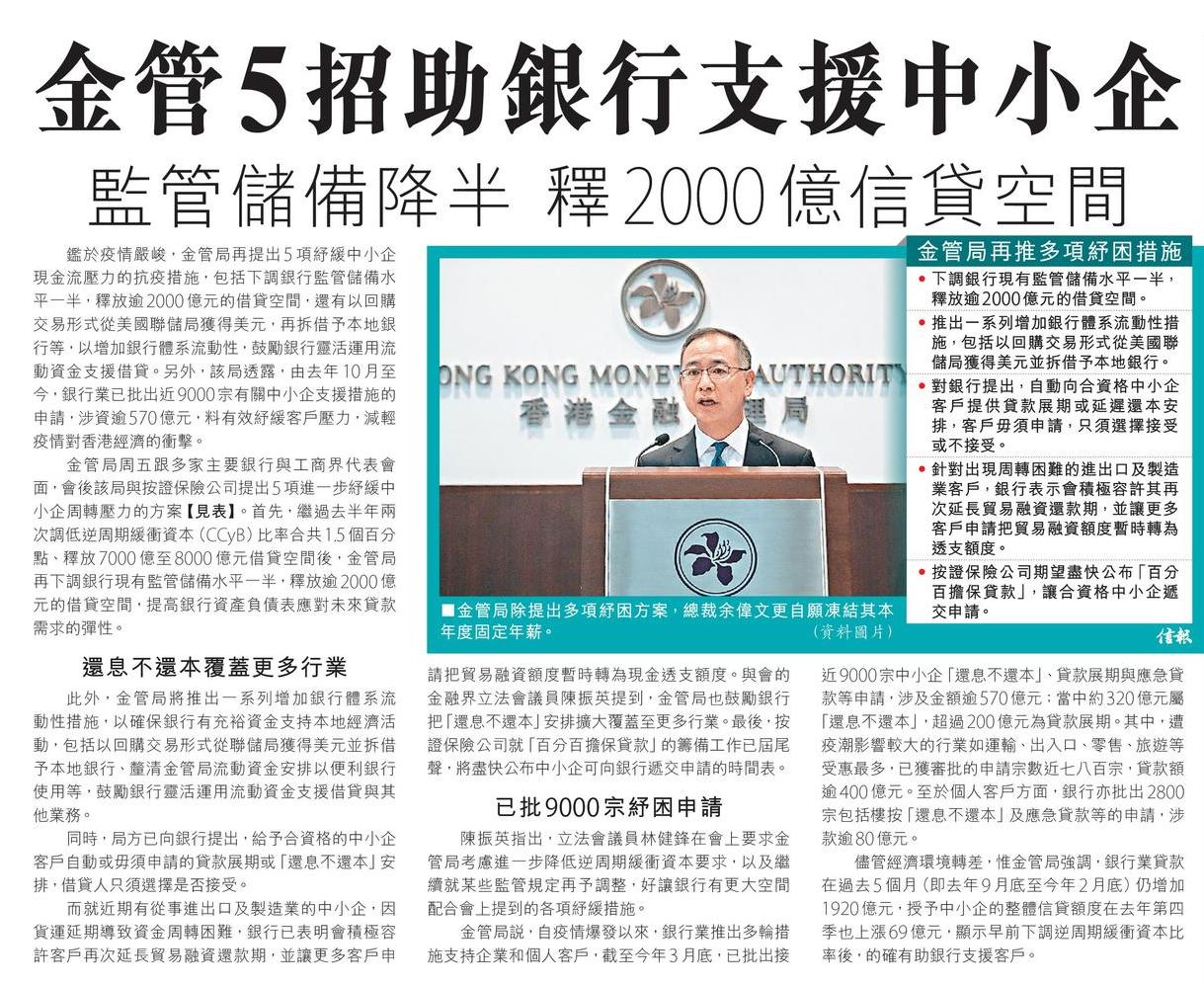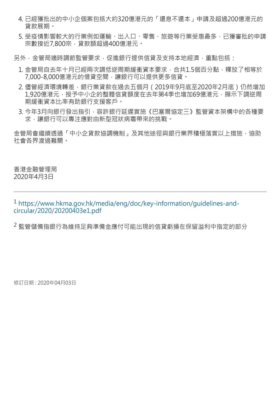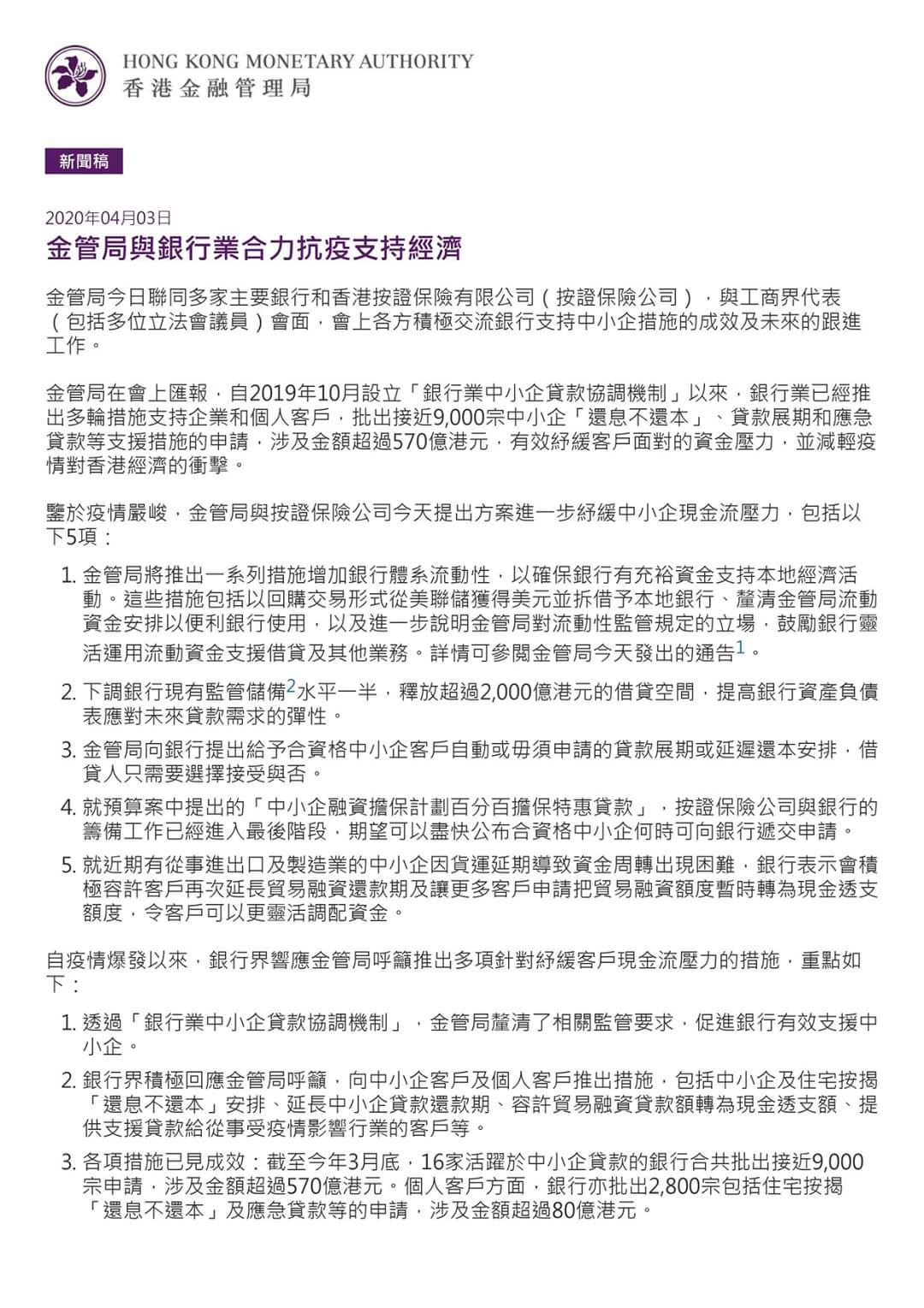 新冠肺炎疫情嚴峻,本人與梁君彥、林健鋒、黃定光、廖長江、吳永嘉、周浩鼎、邵家輝等八位立法會議員與商會代表,約見金管局、按證公司及七家銀行「中銀、匯豐、渣打、花旗、恆生、星展及東亞」的代表,在金管局召開中小企融資溝通會,商討令中小企更易取得融資的措施,以解業界燃眉之急,會後金管局即時宣佈推出五項措施(詳見下列新聞稿)。對於金管局迅速回應,與業界共度時艱表示歡迎。 April 4, 2020 April 4, 2020 附金管局新聞稿及傳媒報導 2020年4月3日金管局新聞稿 2020年4月4日信報報導