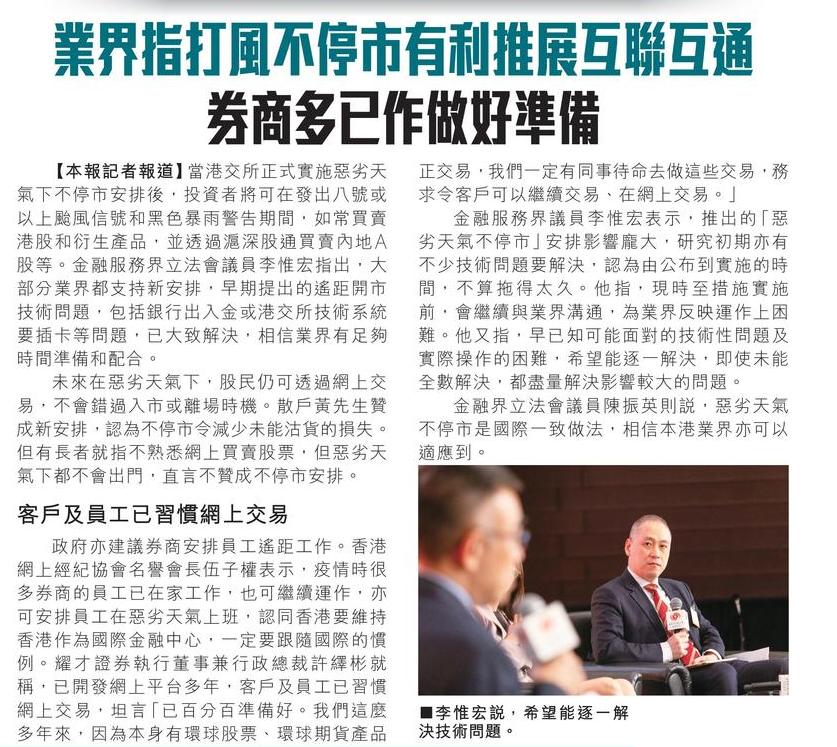 業界指打風不停市有利推展互聯互通 券商多已作做好準備