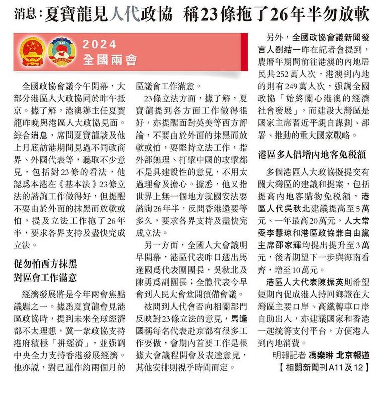 消息:夏寶龍見人代政協 稱23條拖了26年半勿放軟