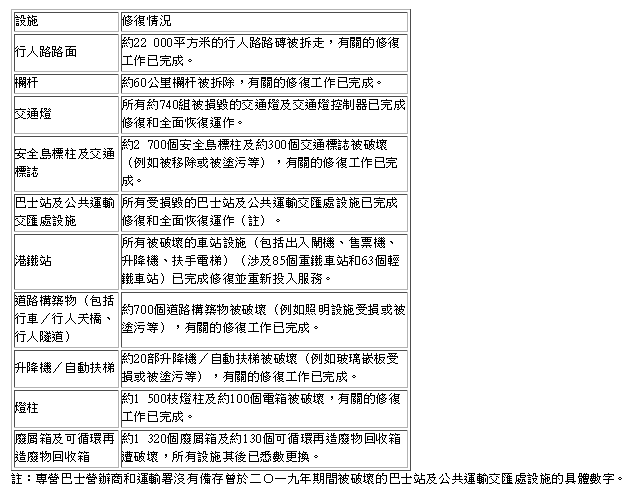 (一) 在「黑暴」期間被破壞的主要公共和交通設施已完成修復,詳情如下: