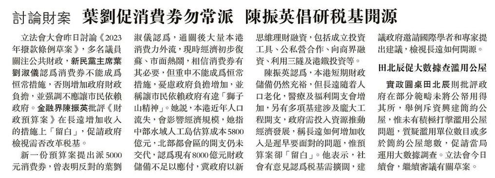 討論財案 葉劉促消費券勿常派 陳振英倡研稅基開源