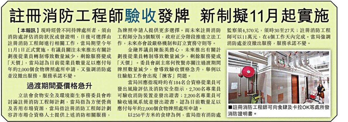 註冊消防工程師驗收發牌 新制擬11月起實施