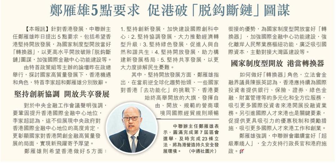 鄭雁雄5點要求 促港破「脫鈎斷鏈」圖謀