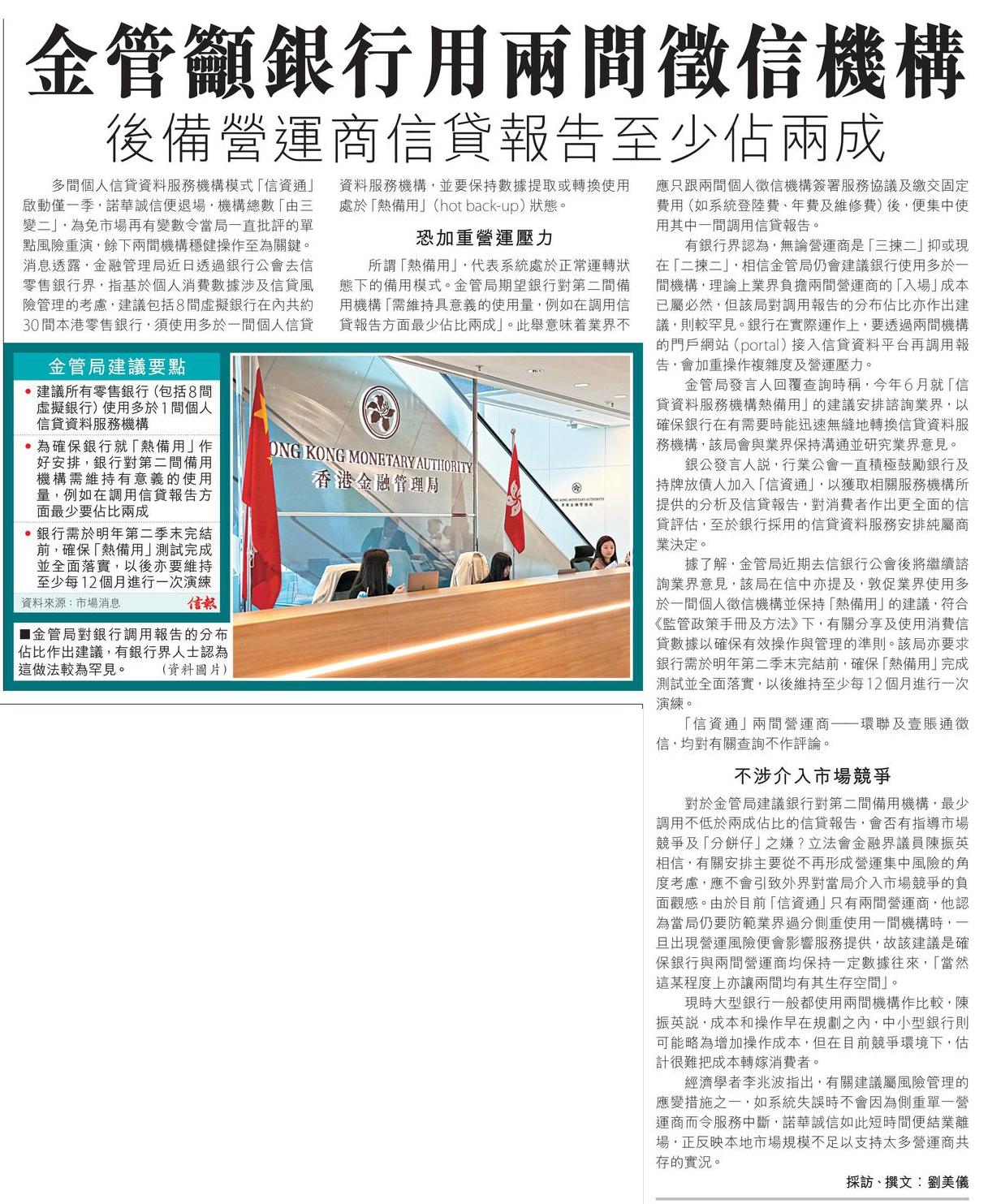 金管籲銀行用兩間徵信機構 後備營運商信貸報告至少佔兩成
