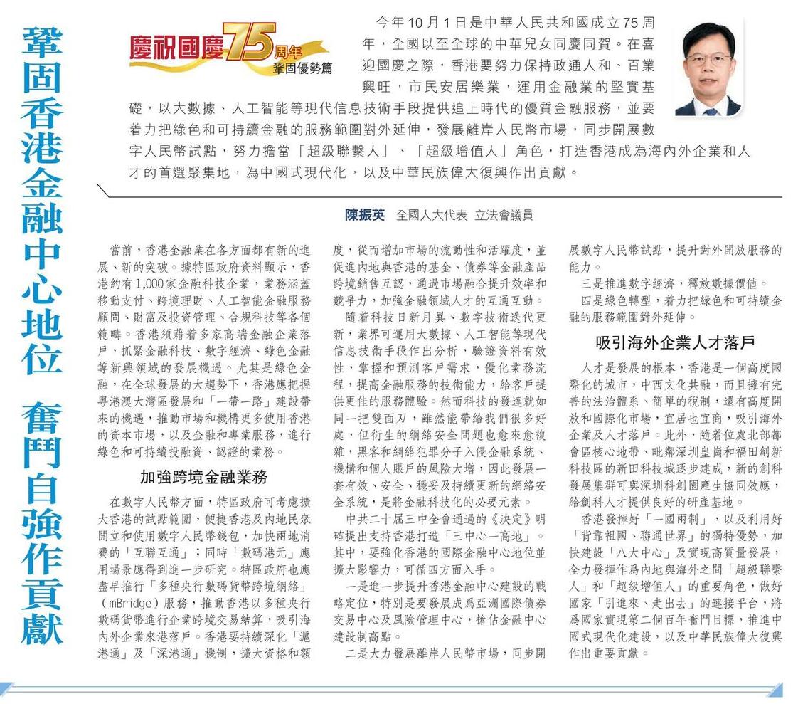 鞏固香港金融中心地位 奮鬥自強作貢獻