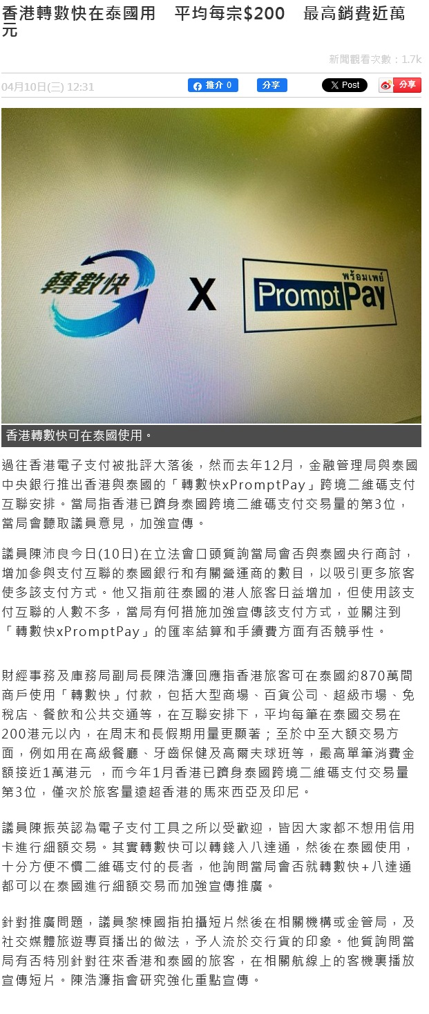 立法會大會 跟進口頭質詢Q4:香港與泰國的跨境二維碼支付互聯