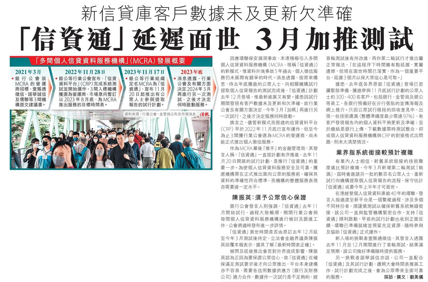「信資通」延遲面世 3月加推測試 新信貸庫客戶數據未及更新欠準確