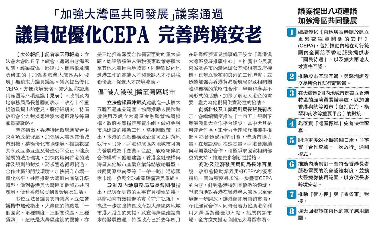 「加強大灣區共同發展」議案通過 議員促優化CEPA 完善跨境安老