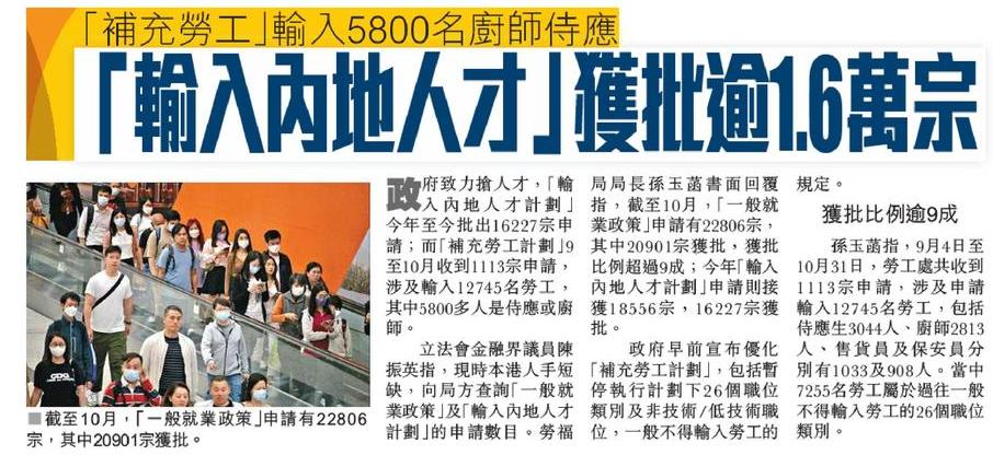 「補充勞工」輸入5800名廚師侍應 「輸入內地人才」獲批逾1.6萬宗