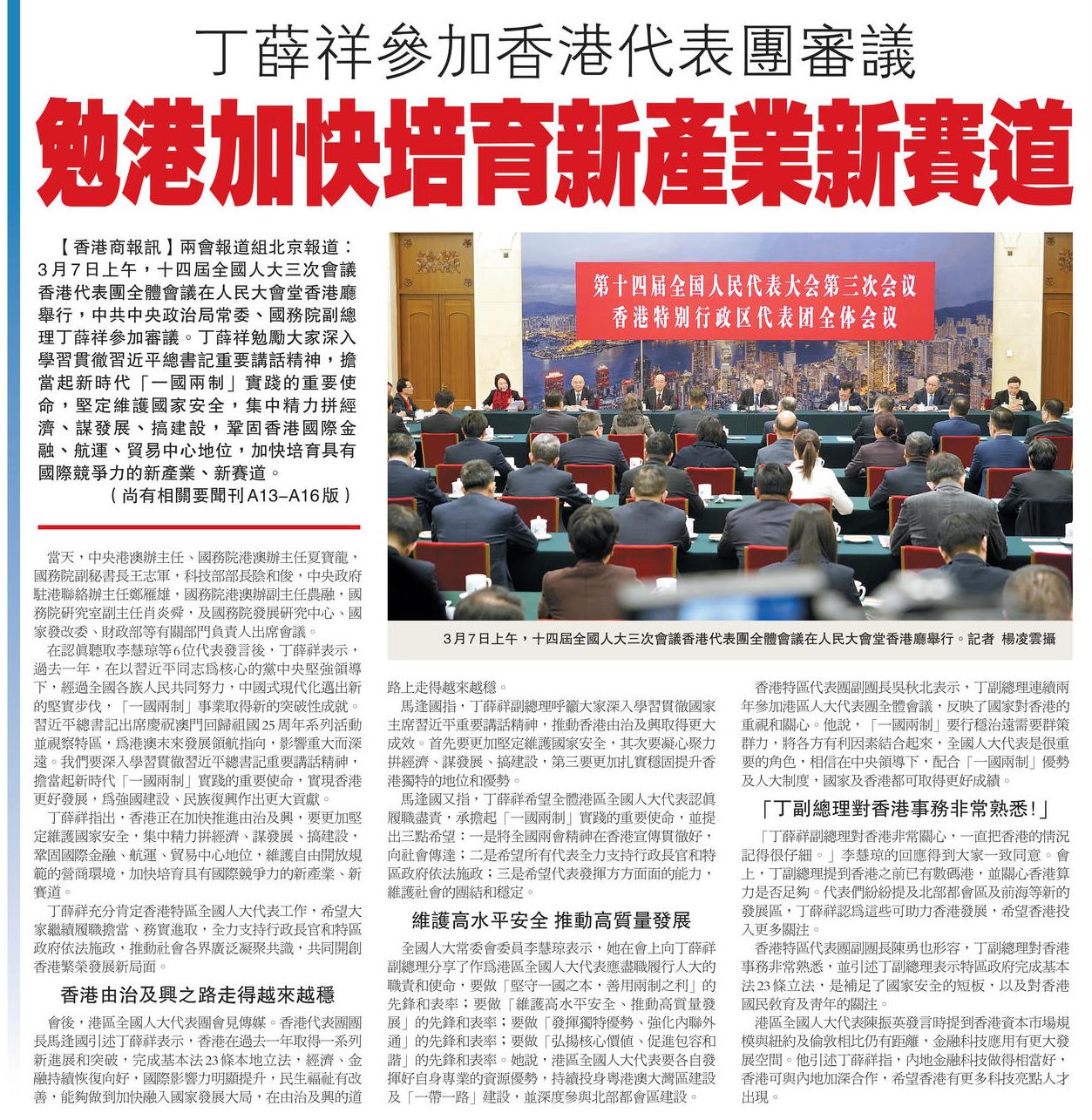 丁薛祥參加香港代表團審議 勉港加快培育新產業新賽道