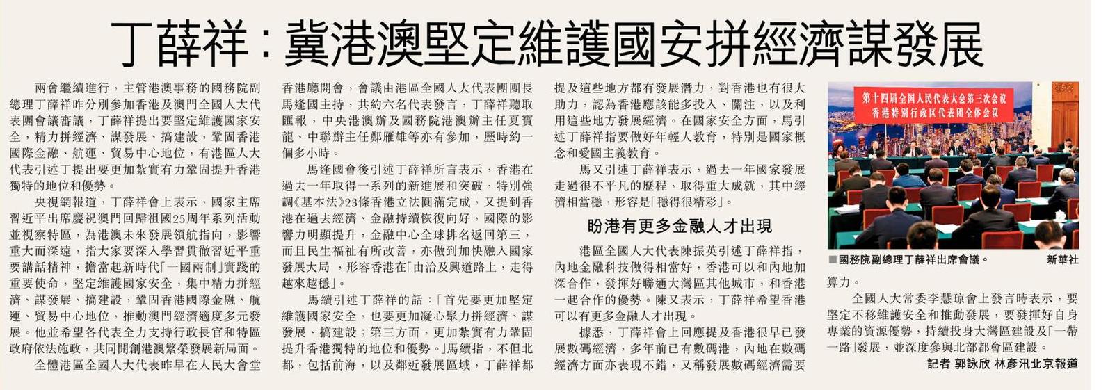 丁薛祥:冀港澳堅定維護國安拼經濟謀發展