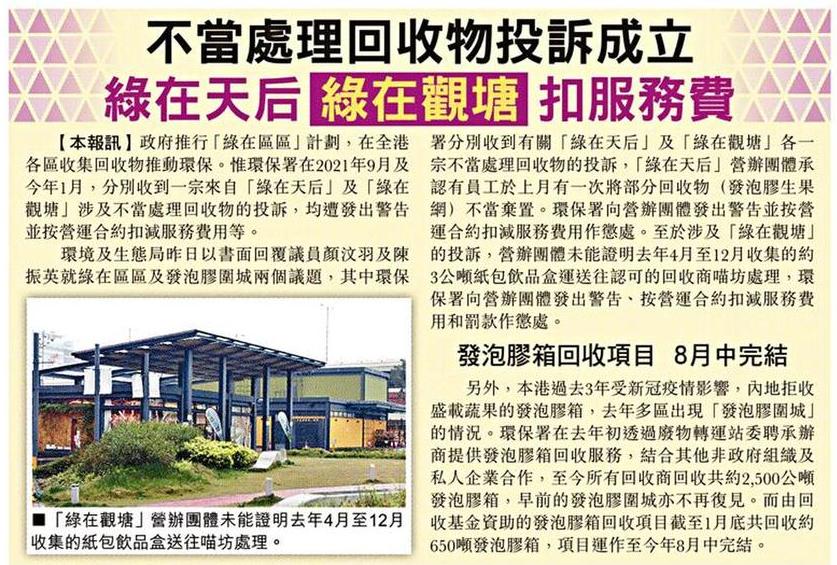 不當處理回收物投訴成立 綠在天后 綠在觀塘 扣服務費