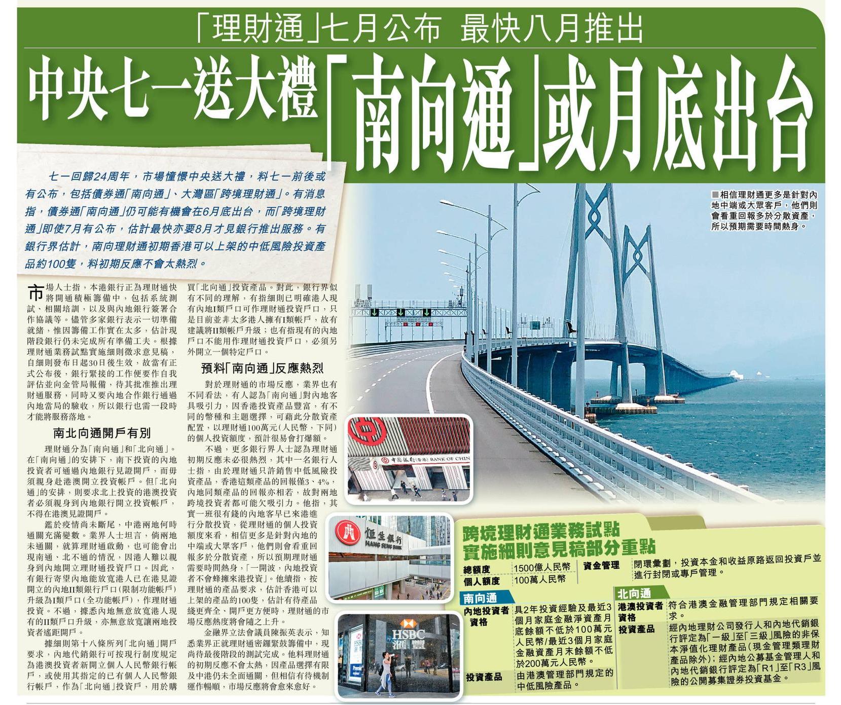 中央七一送大禮 「南向通」或月底出台 「理財通」七月公布 最快八月推出