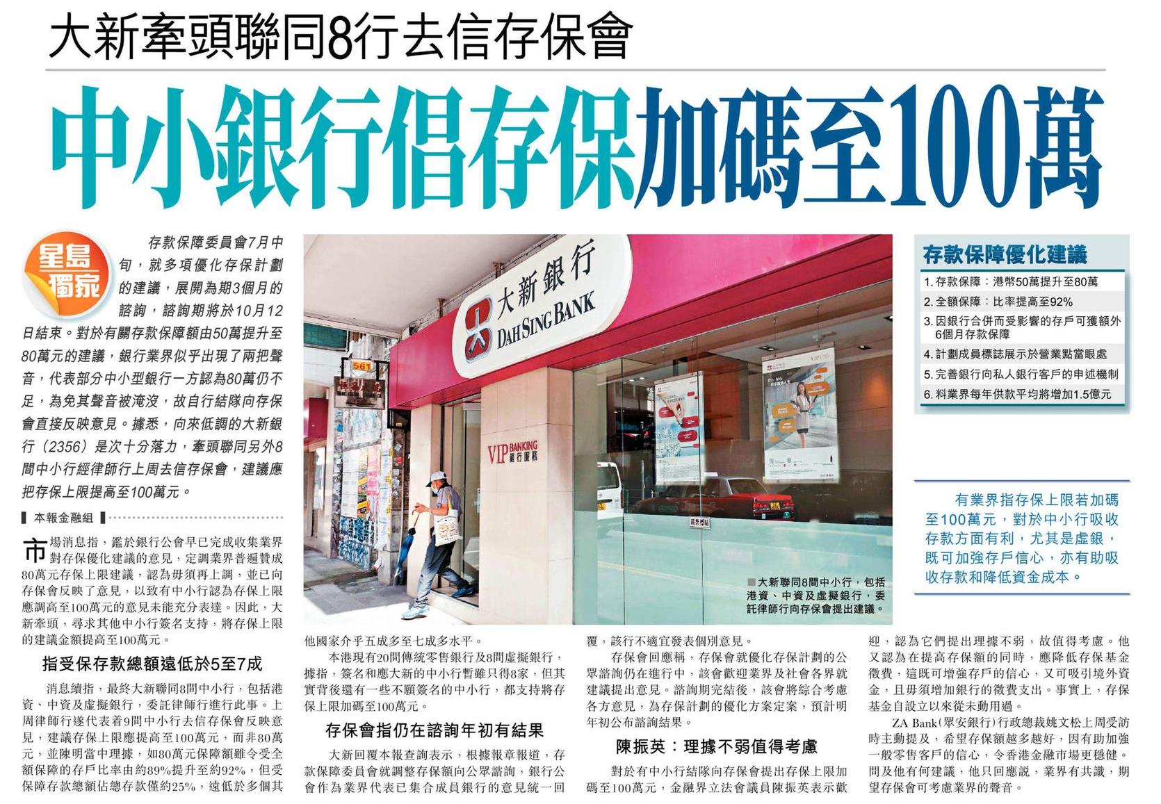 中小銀行倡存保加碼至100萬 大新牽頭聯同8行去信存保會