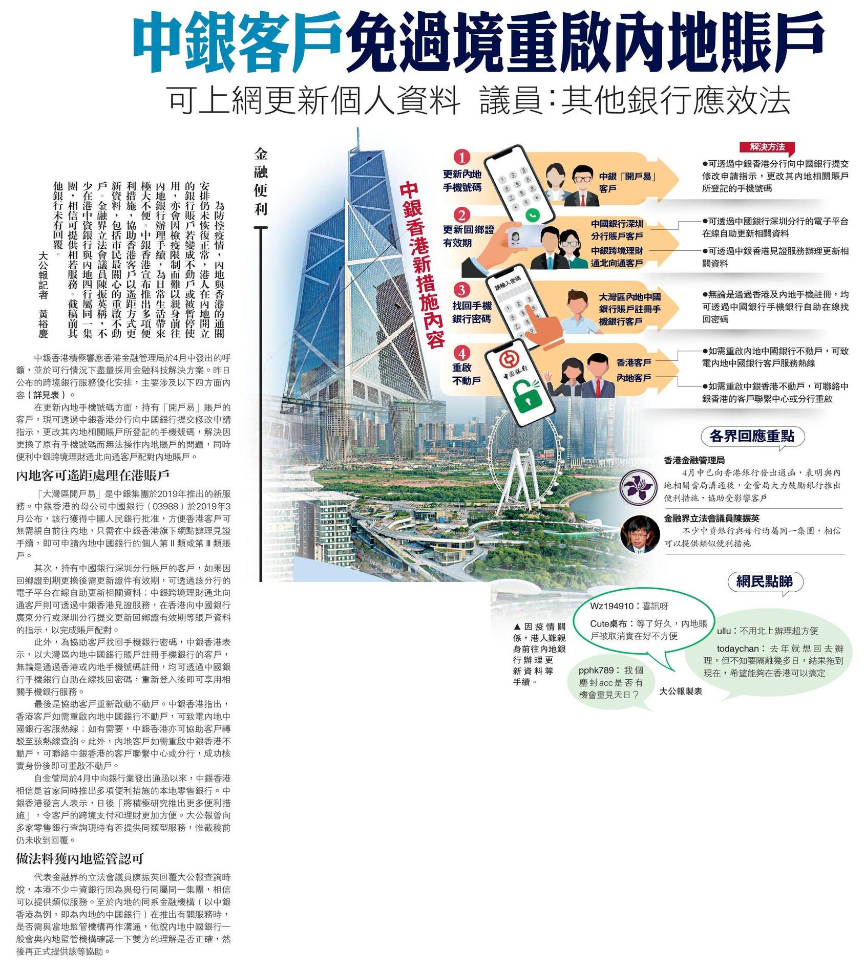 中銀客戶免過境重啟內地賬戶 可上網更新個人資料 議員:其他銀行應效法