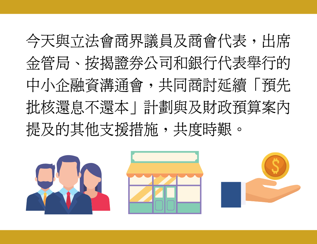 今天與立法會商界議員及商會代表,出席金管局、按揭證券公司和銀行代表舉行的中小企融資溝通會