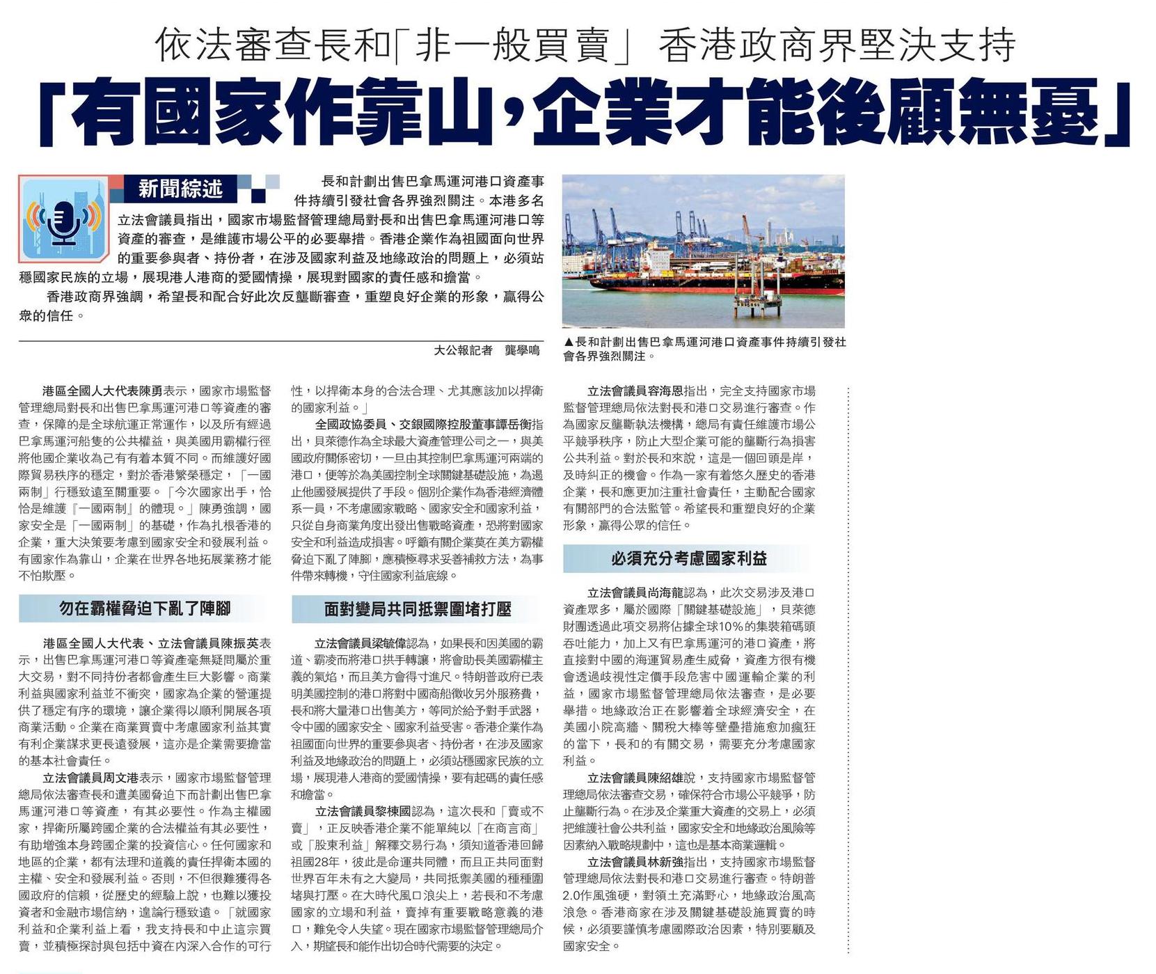 依法審查長和「非一般買賣」 香港政商界堅決支持 「有國家作靠山,企業才能後顧無憂」