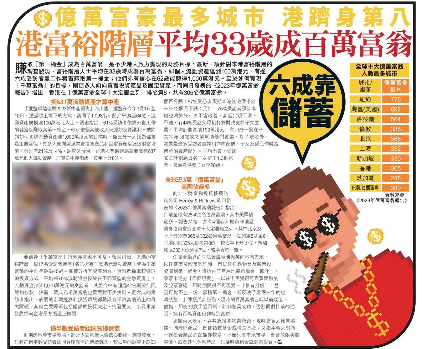 億萬富豪最多城市 港躋身第八 港富裕階層平均33歲成百萬富翁 六成靠儲蓄