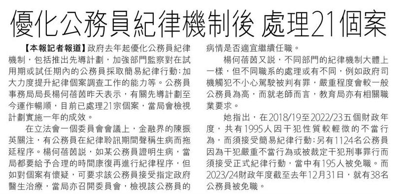 優化公務員紀律機制後 處理21個案