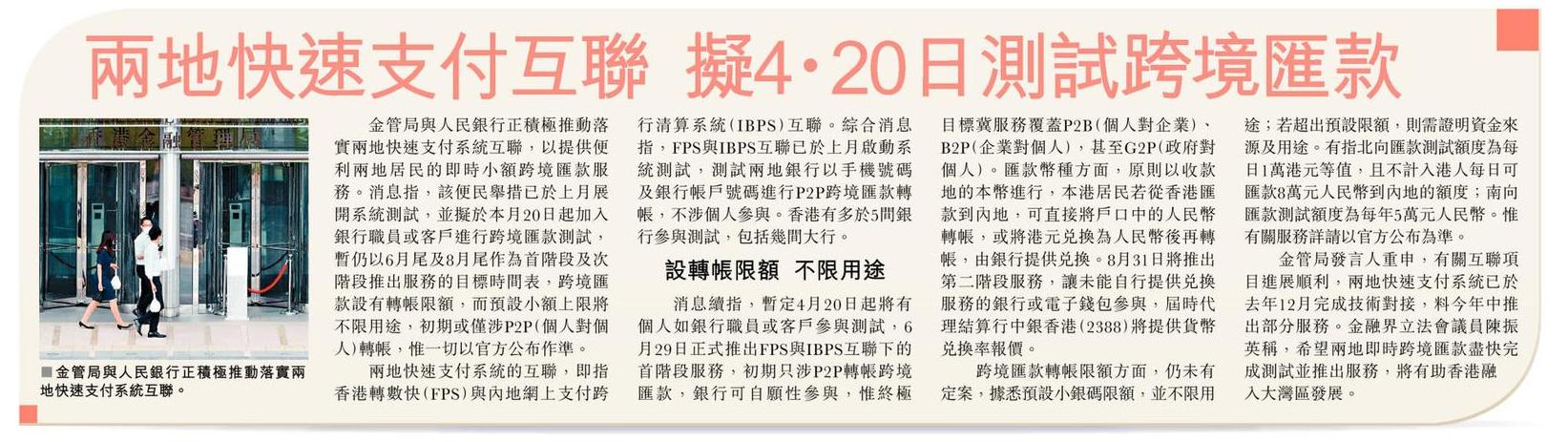 兩地快速支付互聯 擬4·20日測試跨境匯款