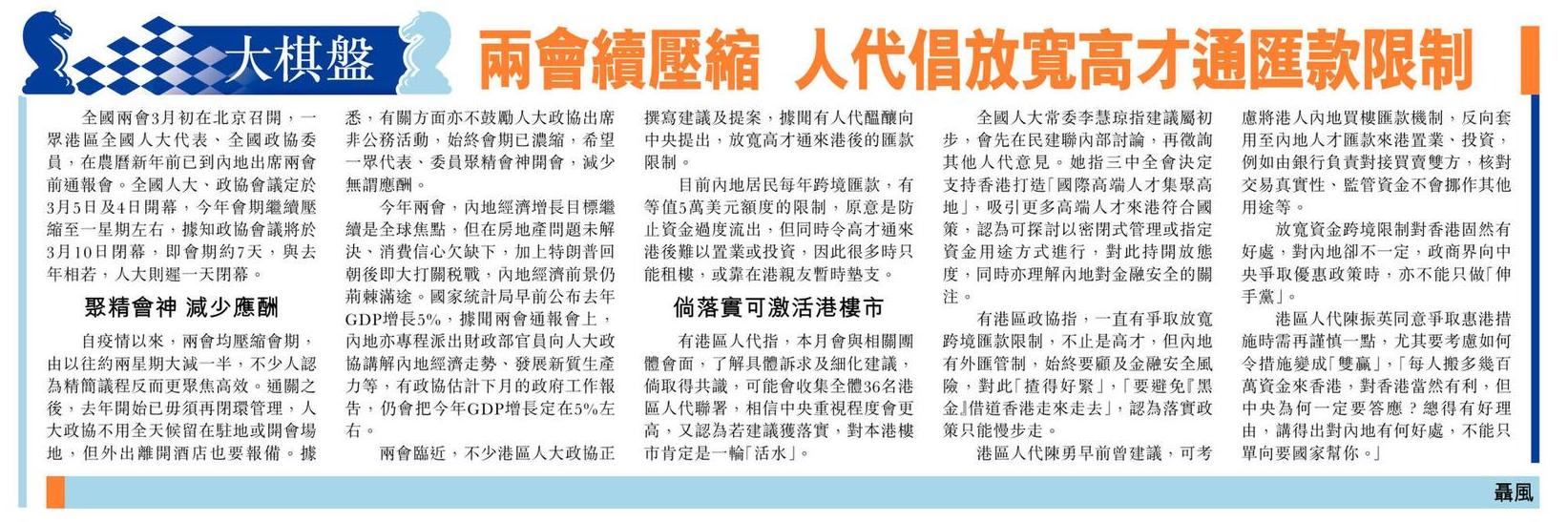 兩會續壓縮 人代倡放寬高才通匯款限制