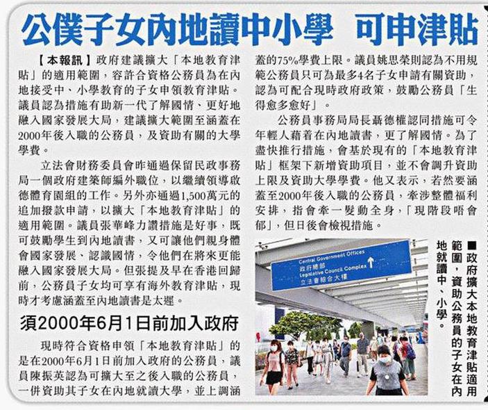 公僕子女內地讀中小學 可申津貼