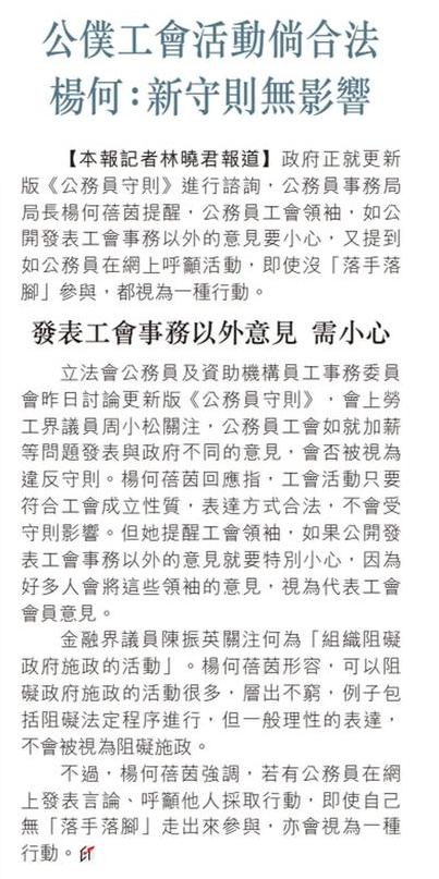 公僕工會活動倘合法 楊何:新守則無影響