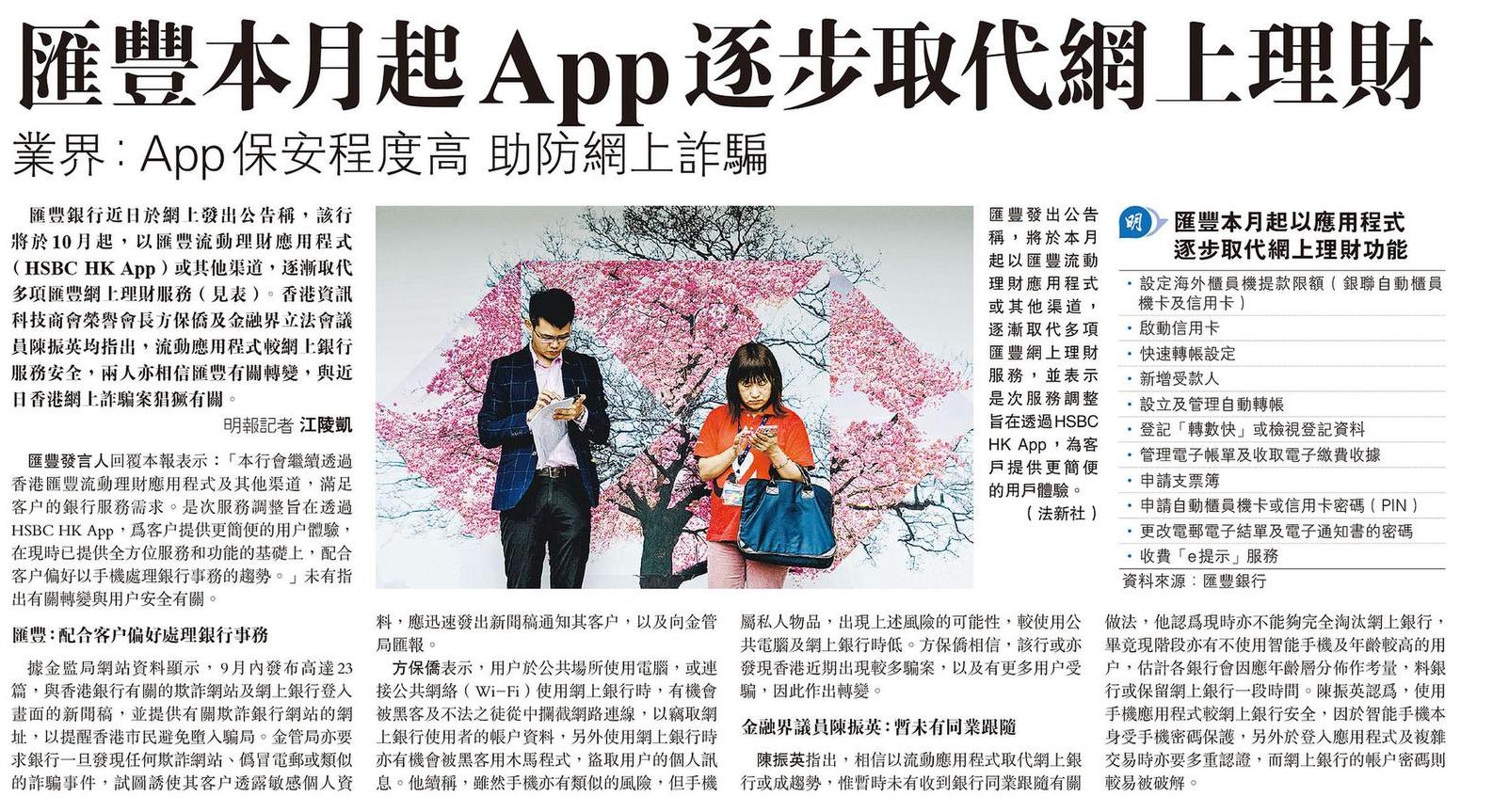 匯豐本月起App逐步取代網上理財 業界:App保安程度高 助防網上詐騙