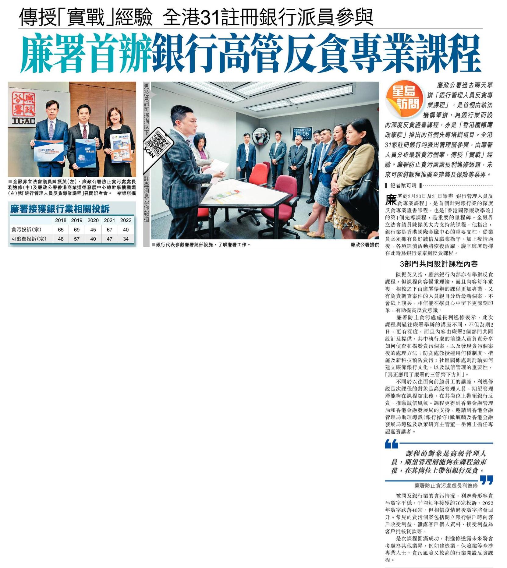 廉署首辦銀行高管反貪專業課程 傳授「實戰」經驗 全港31註冊銀行派員參與