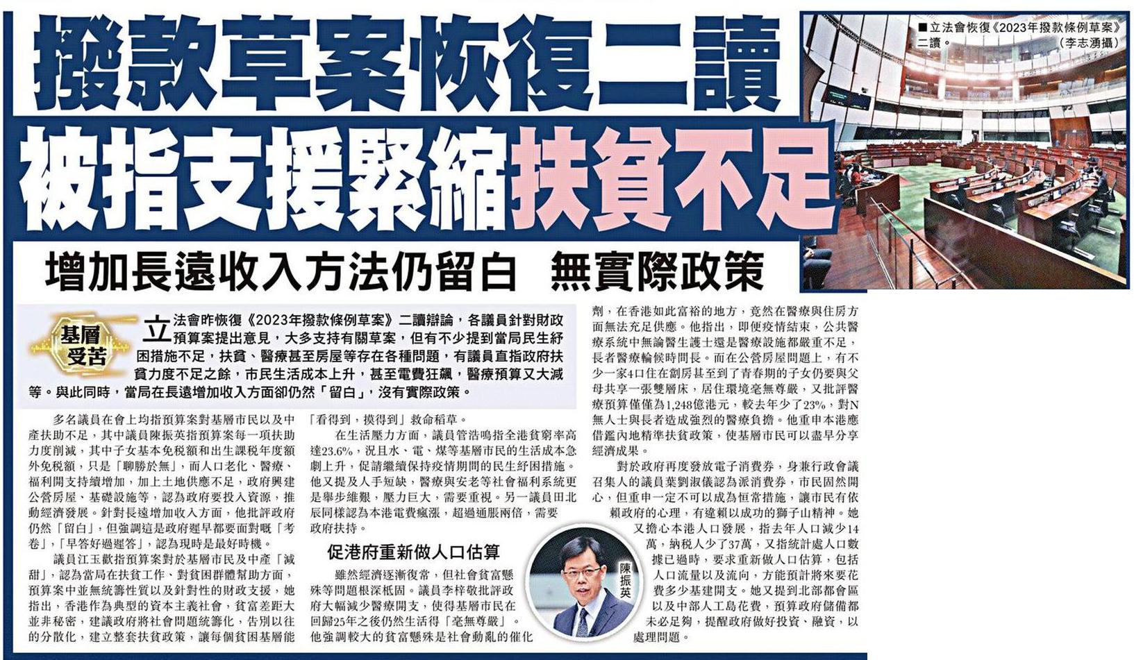 撥款草案恢復二讀 被指支援緊縮 扶貧不足 增加長遠收入方法仍留白 無實際政策