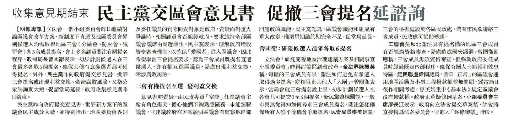 收集意見期結束 民主黨交區會意見書 促撤三會提名延諮詢