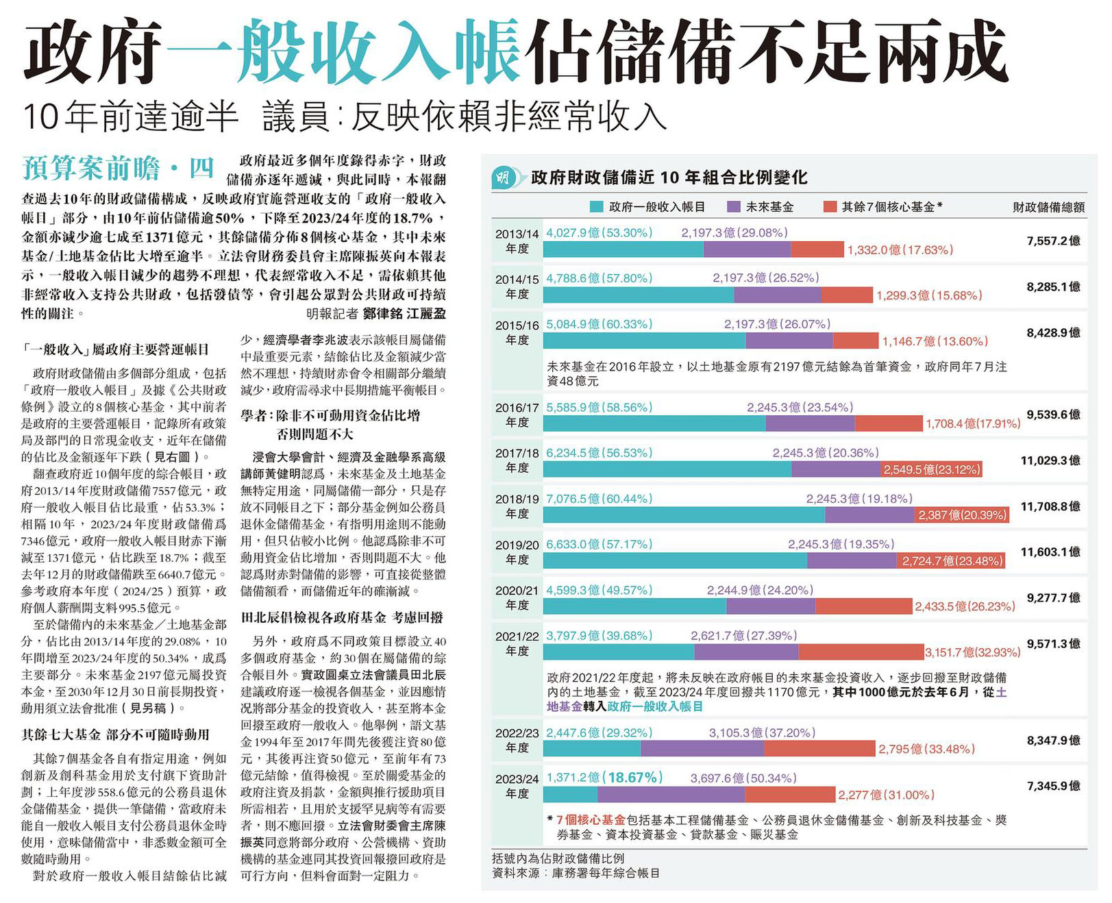 政府一般收入帳佔儲備不足兩成 10年前達逾半 議員:反映依賴非經常收入